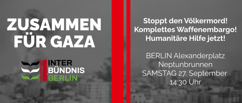 Der Demonstrationszug „Zusammen für Gaza“ am 27.09. verspricht, eine große Protestaktion für Palästina zu werden. Sie richtet sich an Teile der Gesellschaft, die palästinensische Stimmen bisher nicht in den Vordergrund gestellt haben. Die Demonstration bietet eine Plattform, bei der neue Akteure aus der Gesellschaft die Forderungen zum dringenden Ende des Genozids unterstützen und in die breite Masse tragen können.